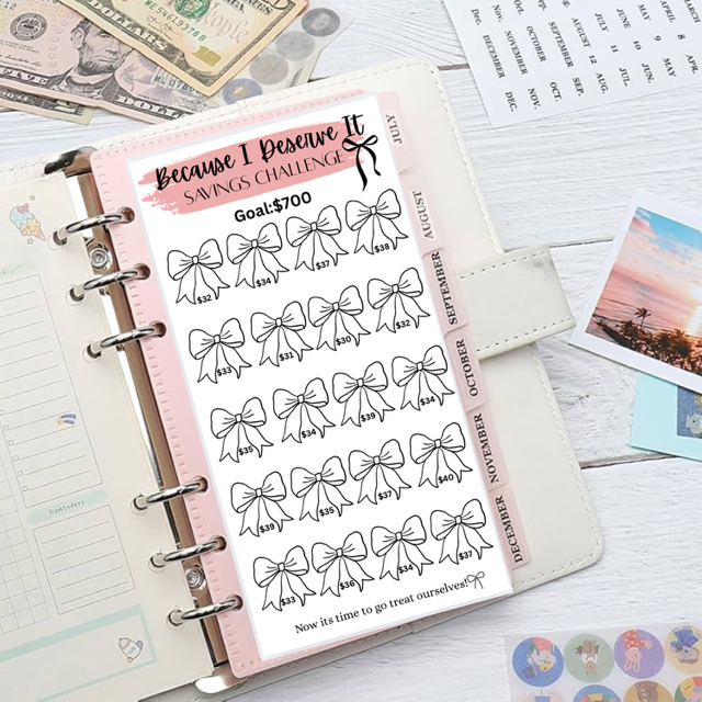 Featuring a black and white bow theme, this $700 challenge turns your savings journey into a celebration of self-love. Strike through the randomized numbers or COLOR in each cute bow as you get closer to your goal—your future self will thank you.