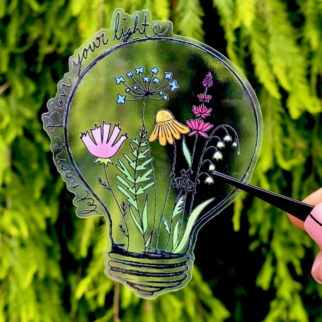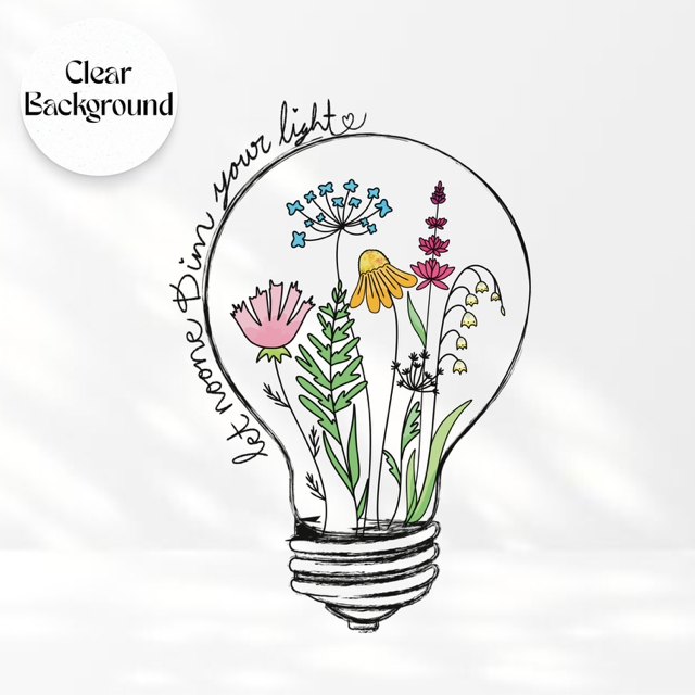 Brighten your day and your space with our "Let No One Dim Your Light" clear vinyl sticker. Featuring a minimalist lightbulb design filled with delicate wildflowers for a subtle pop of color, this sticker is more than just pretty—it's a daily reminder to protect your spark and stand confidently in your worth.