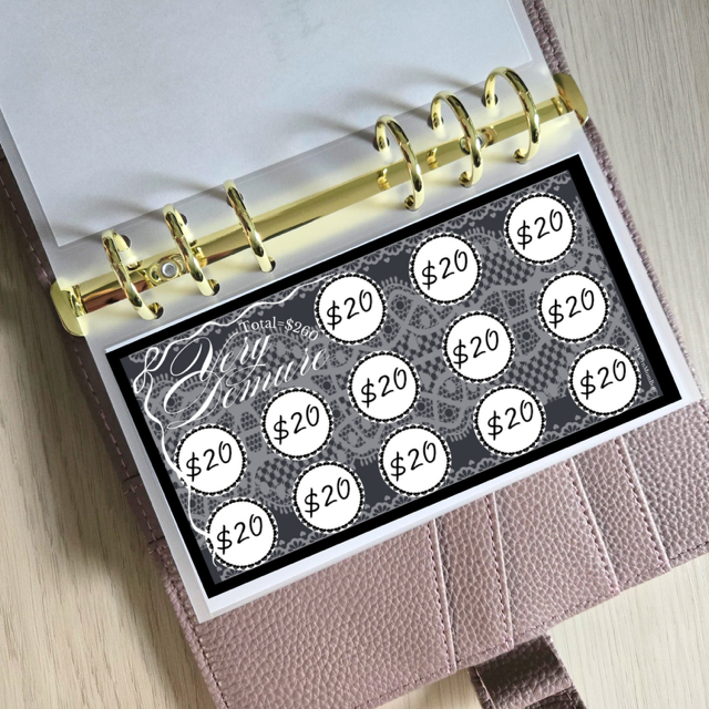 Add a touch of elegance to your budgeting routine with this black lace coquette-inspired scratch-off challenge. Perfectly designed to fit A6 binders, this savings tracker blends beauty and functionality with a mysterious twist.